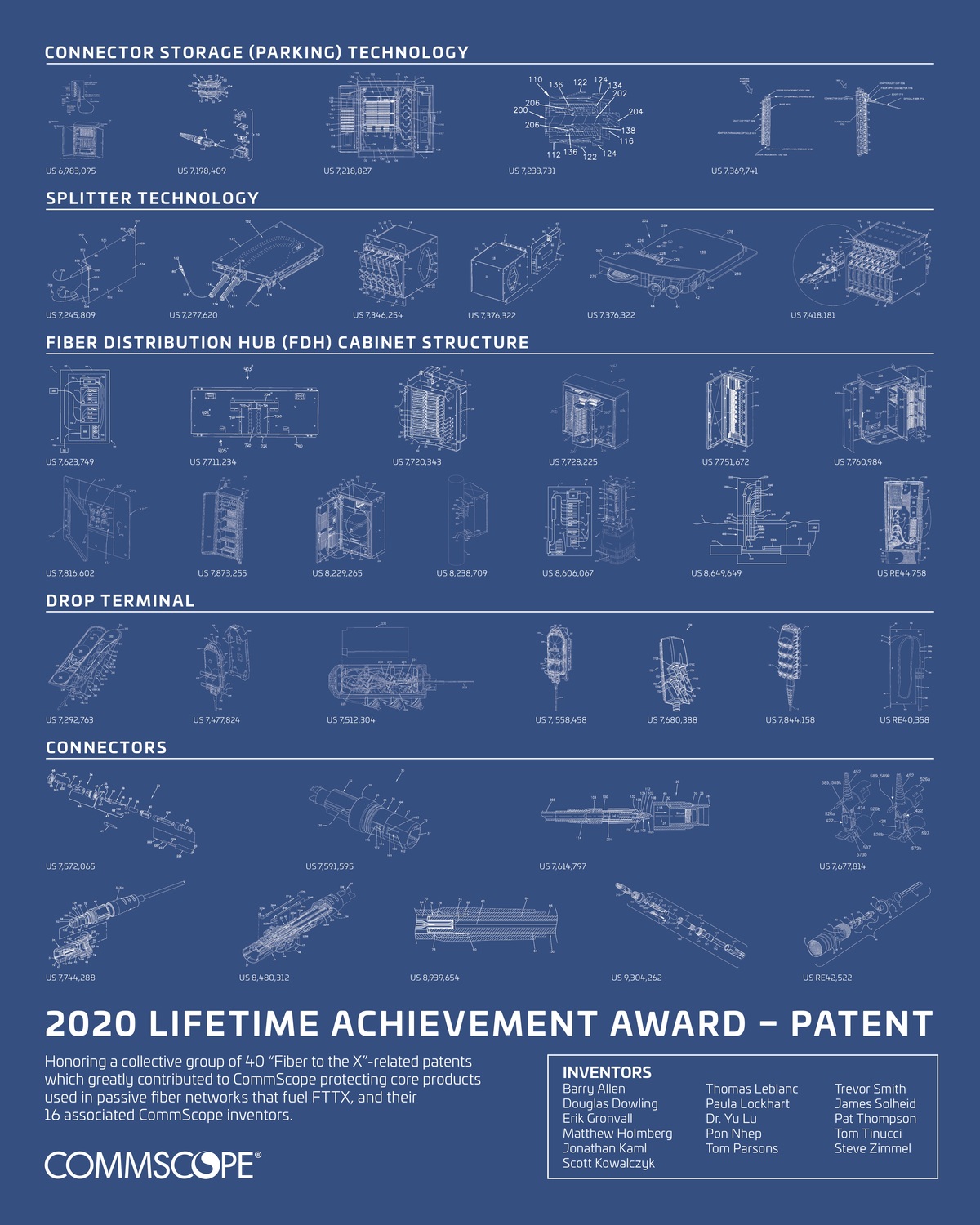 CommScope recognized 16 innovators for their contributions to this award-winning FTTX patent portfolio: Barry Allen, Douglas Dowling, Erik Gronvall, Matthew Holmberg, Jonathan Kaml, Scott Kowalczyk, Thomas Leblanc, Paula Lockhart, Dr. Yu Lu, Pon Nhep, Tom Parsons, Trevor Smith, James Solheid, Pat Thompson, Tom Tinucci, and Steve Zimmel.